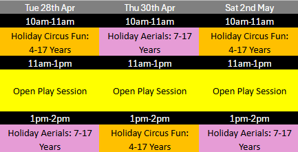 All your favourites and some new things: Trapeze, Silks, Lyra, Loops, Pole, Rope, Net.